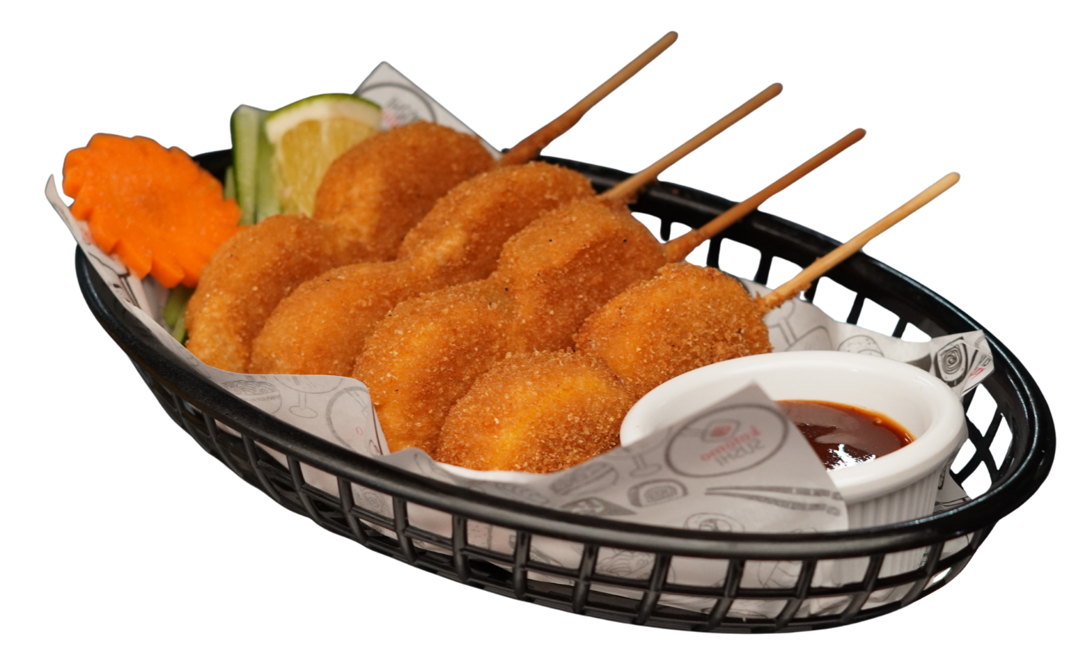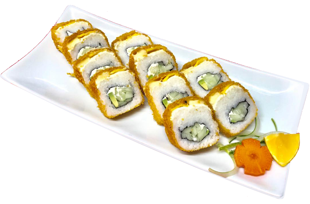 Bola de arroz empanizada, rellena de aguacate, philadelphia, trocitos de pepino, anguila, cebollín y ajonjolí. Acompañada con tampico.