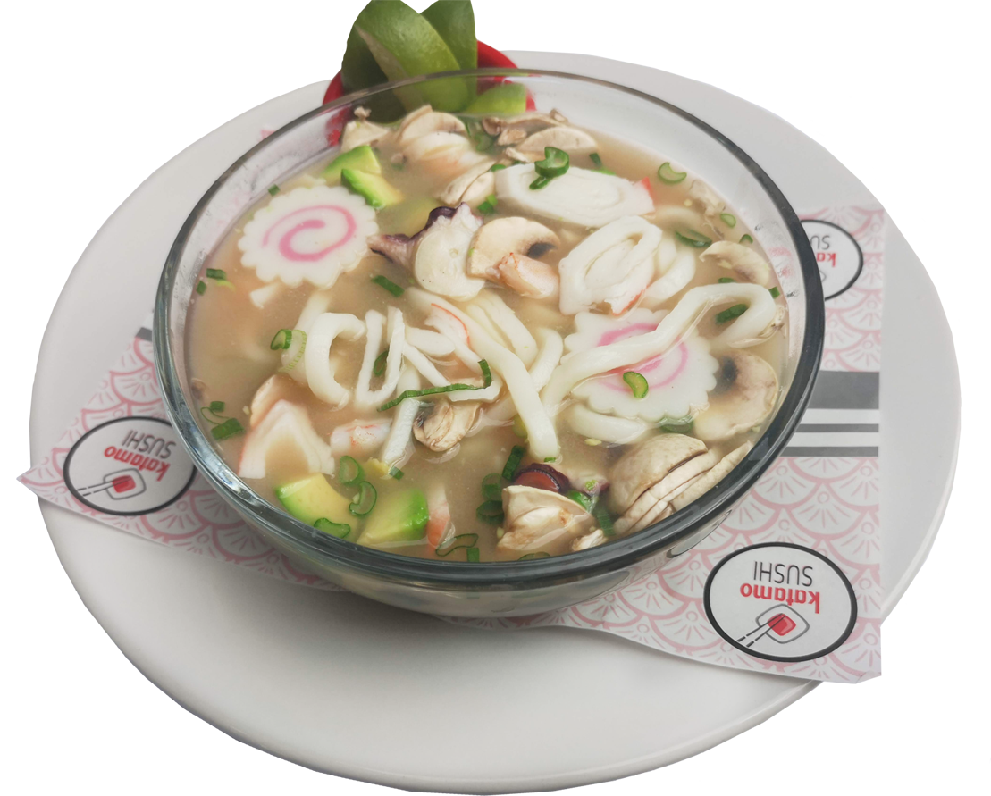 Pasta udón con camarón, pulpo, cangrejo, champiñones, naruto y aguacate, con un toque de cebollín y nori.