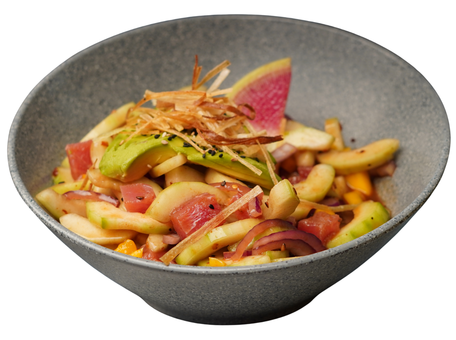 Atún fresco importado, cebolla morada, pepino en julianas y trozos de mango. Marinado con salsas negras de la casa y un toque de chile de árbol en aceite, aguacate, ajonjolí y poro frito.