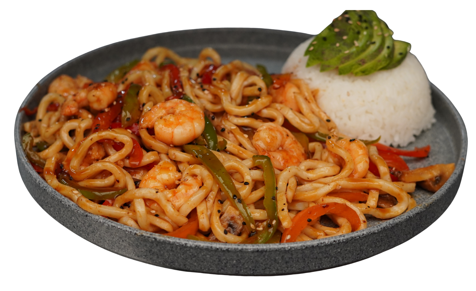Pasta udón salteada con mezcla de pimientos, champiñones y salsa teriyaki. Porción de arroz gohan coronado con aguacate y ajonjolí negro. Pollo $230 Res $240 Camarón $249 Mixto $259