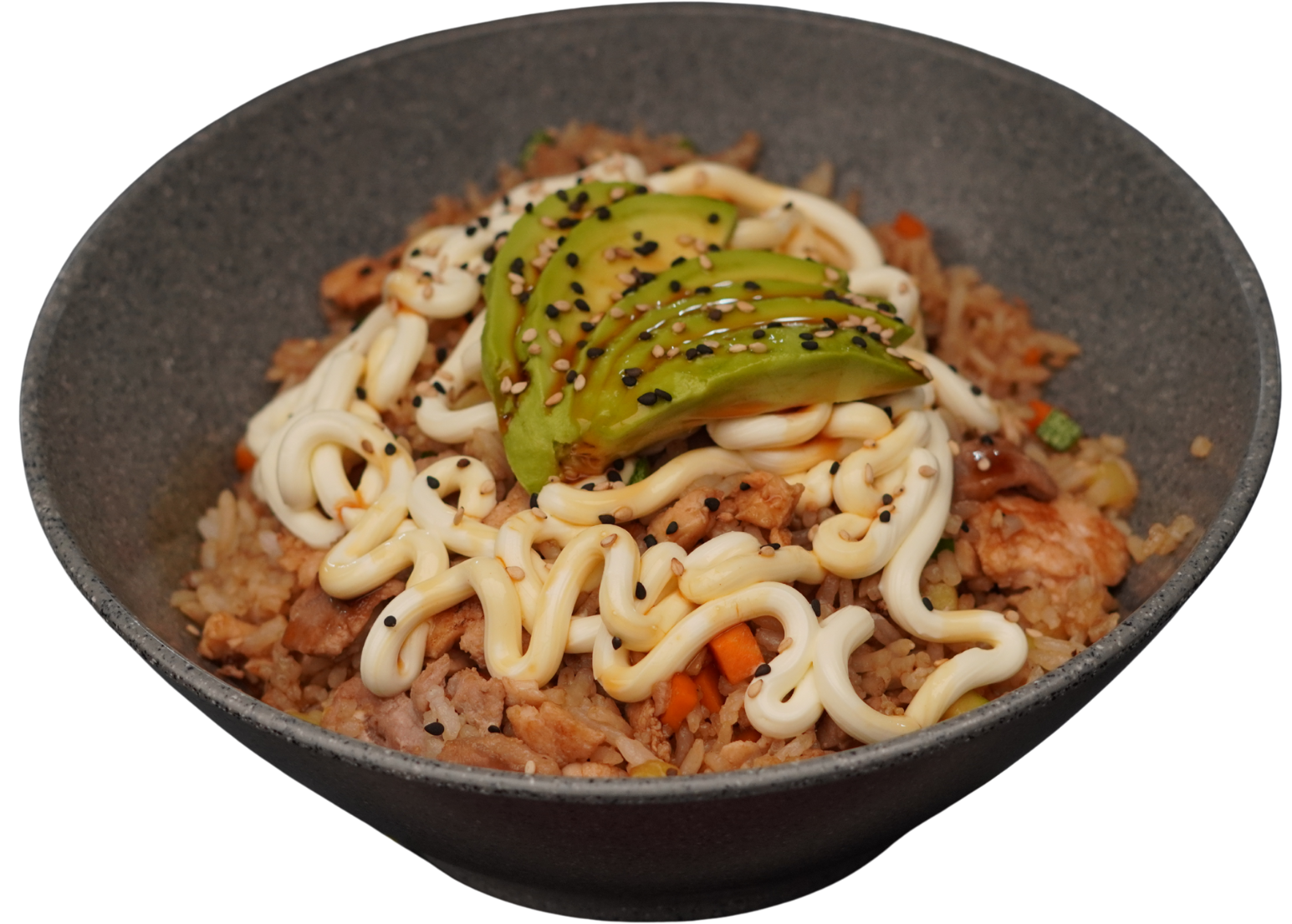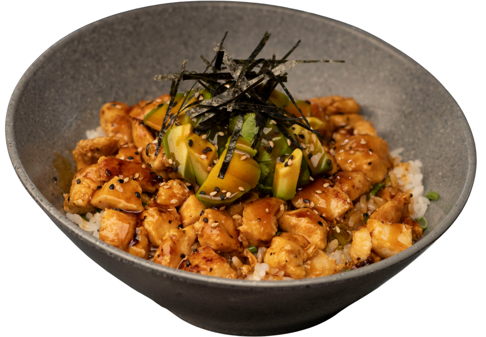 Arroz gohan preparado con pollo teriyaki y trozos de aguacate. Servido con ajonjolí, salsa de anguila y nori.