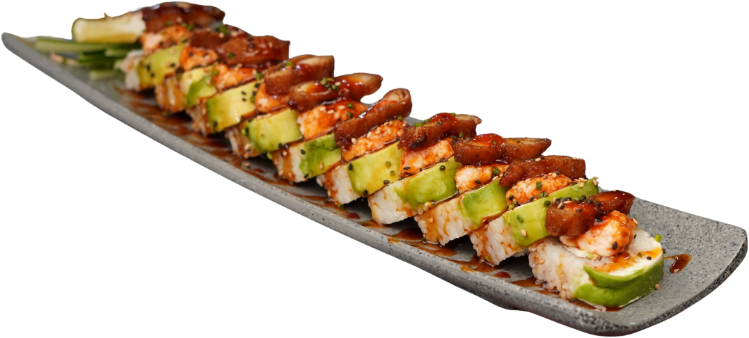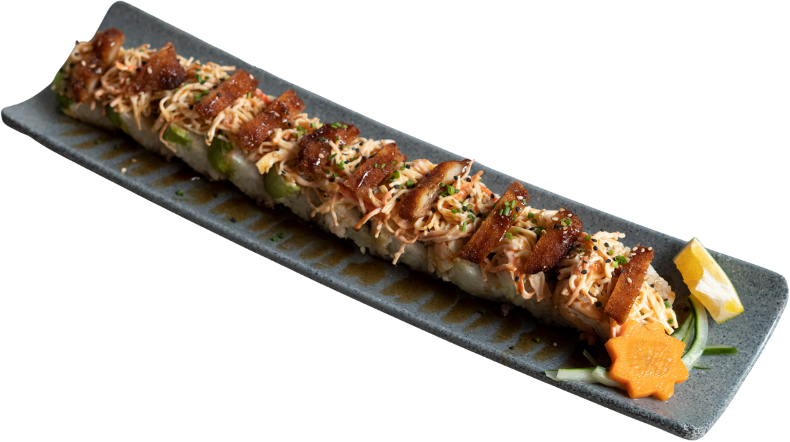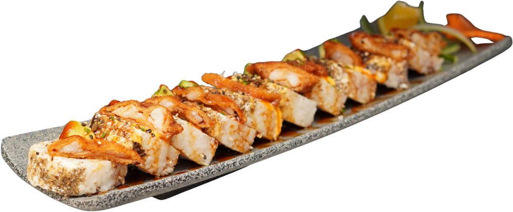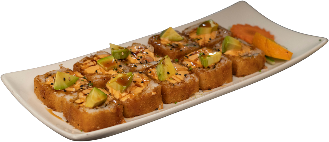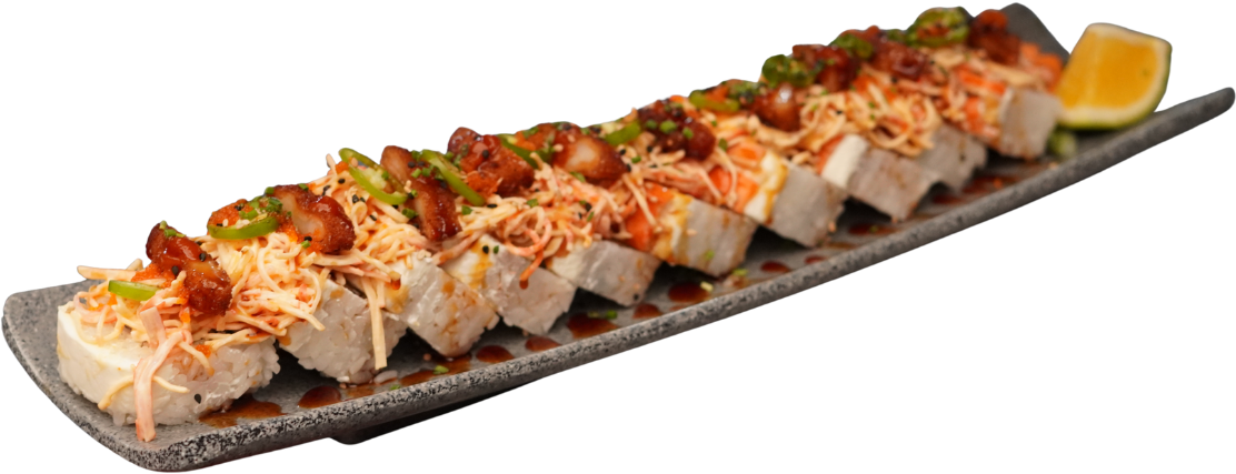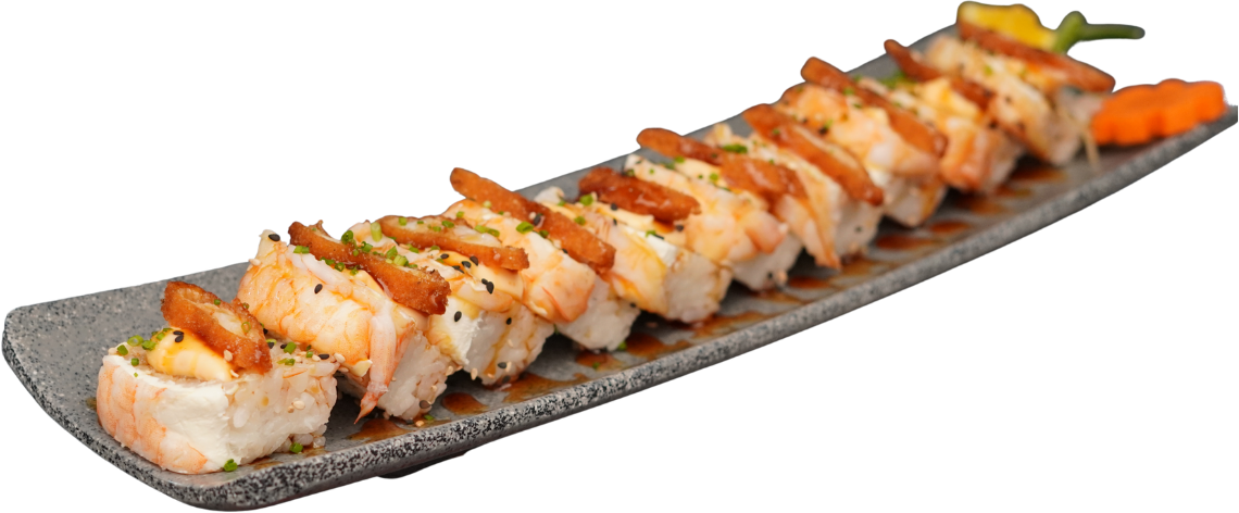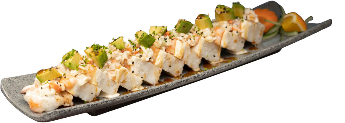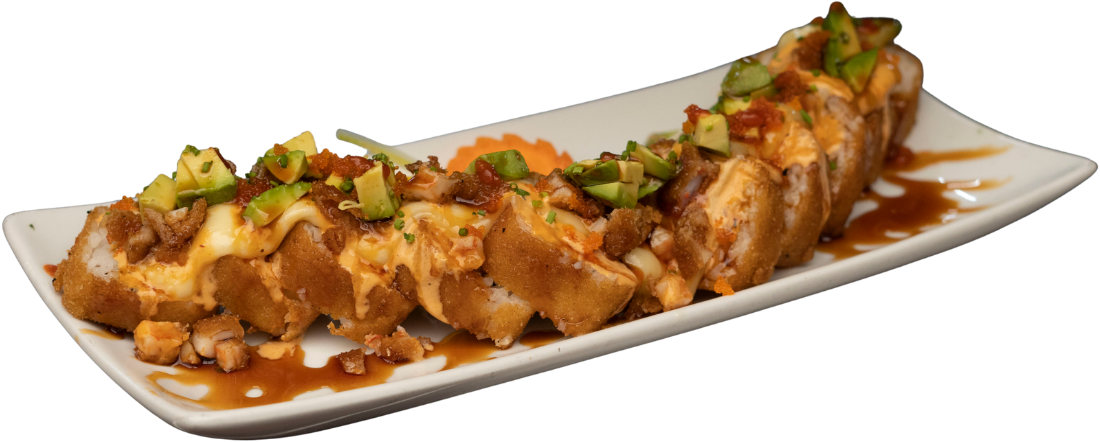 Rollo empanizado relleno de camarón, coronado con ensalada kani, trozos de aguacate, camarón empanizado, bañado con aderezo chipotle y puntito de sriracha.