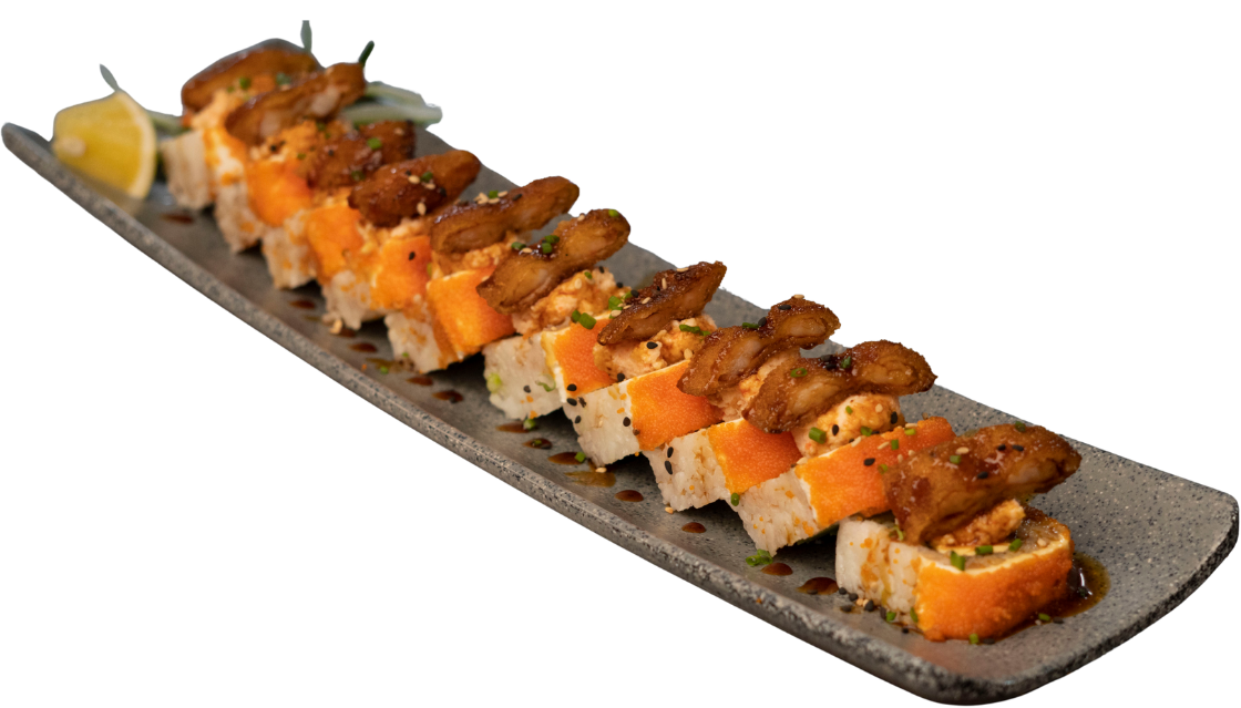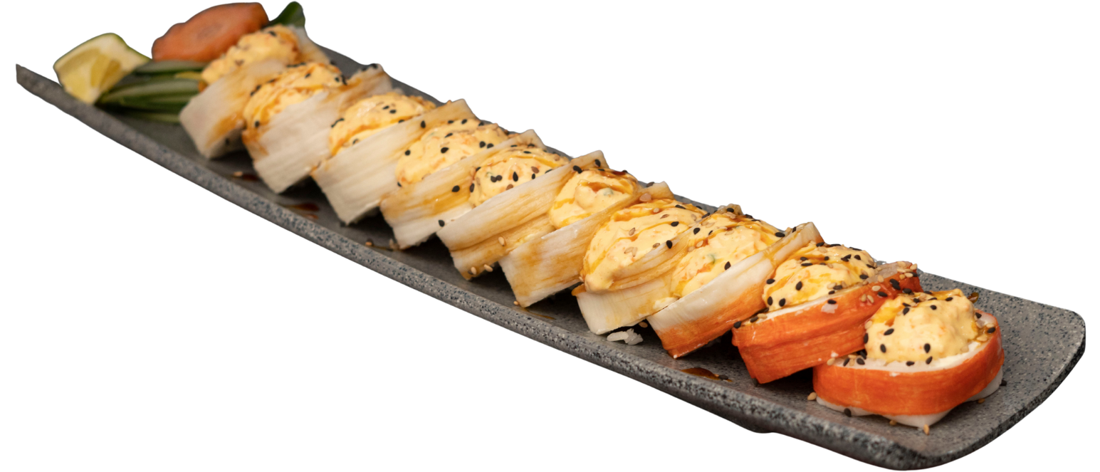 Rollo empanizado, relleno de tocino, pollo y camarón; gratinado con queso gouda y aderezo chipotle. Coronado con trozos de camarón empanizado, aguacate y masago.