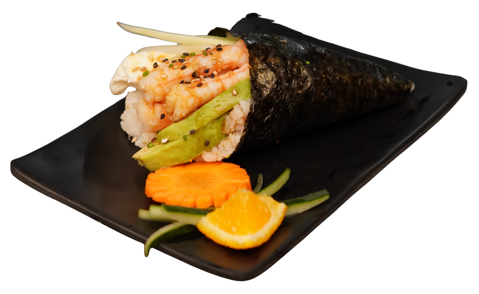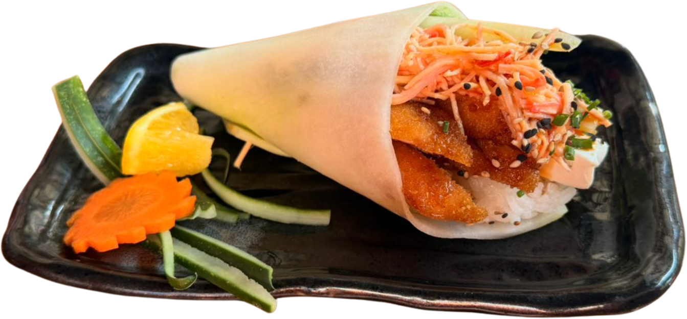 Cono de arroz envuelto en lamina de pepino; relleno con camarones empanizados, aguacate, philadelphia, ensalada kanikama, salsa de anguila y ajonjolí..