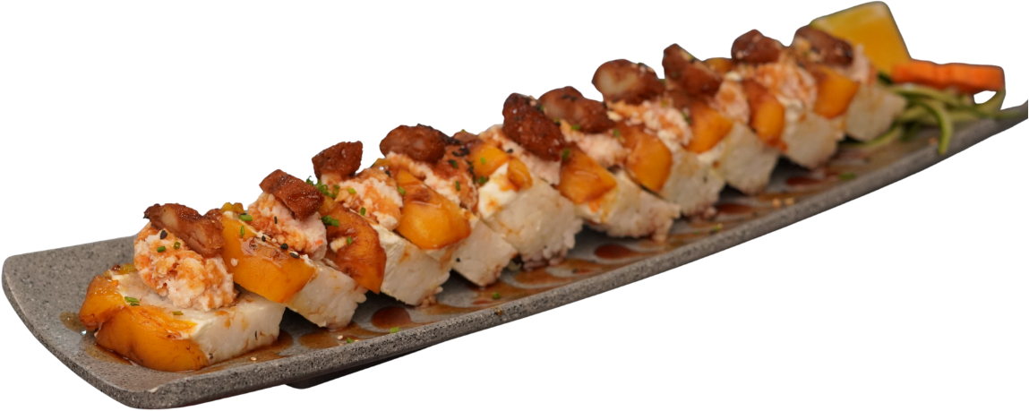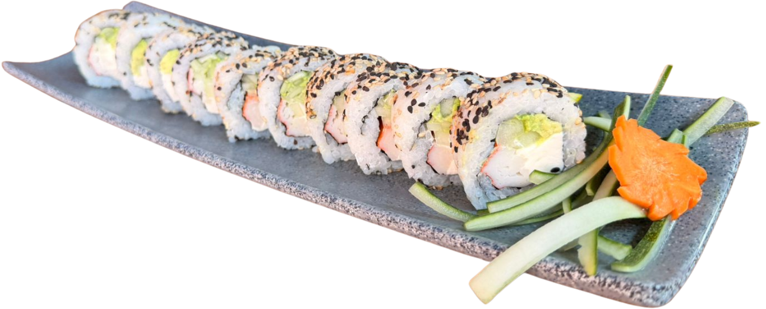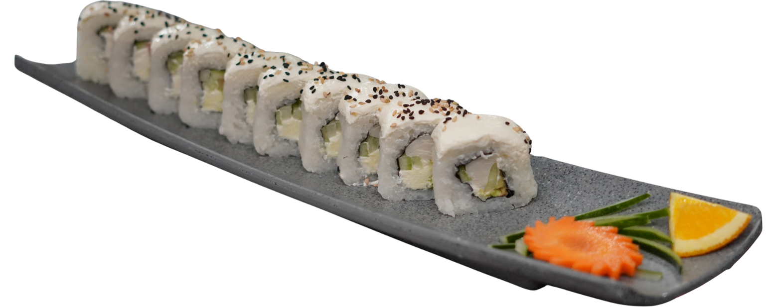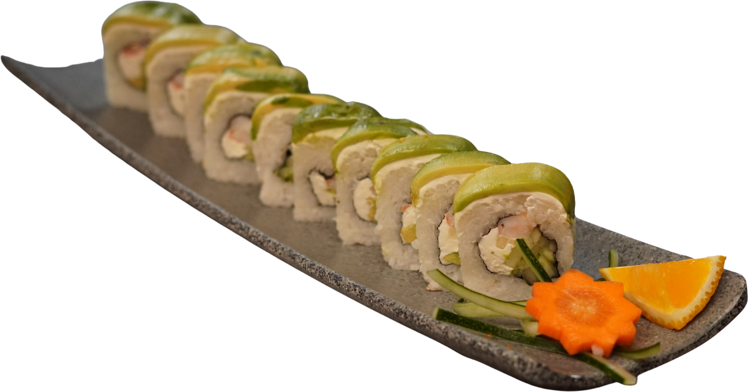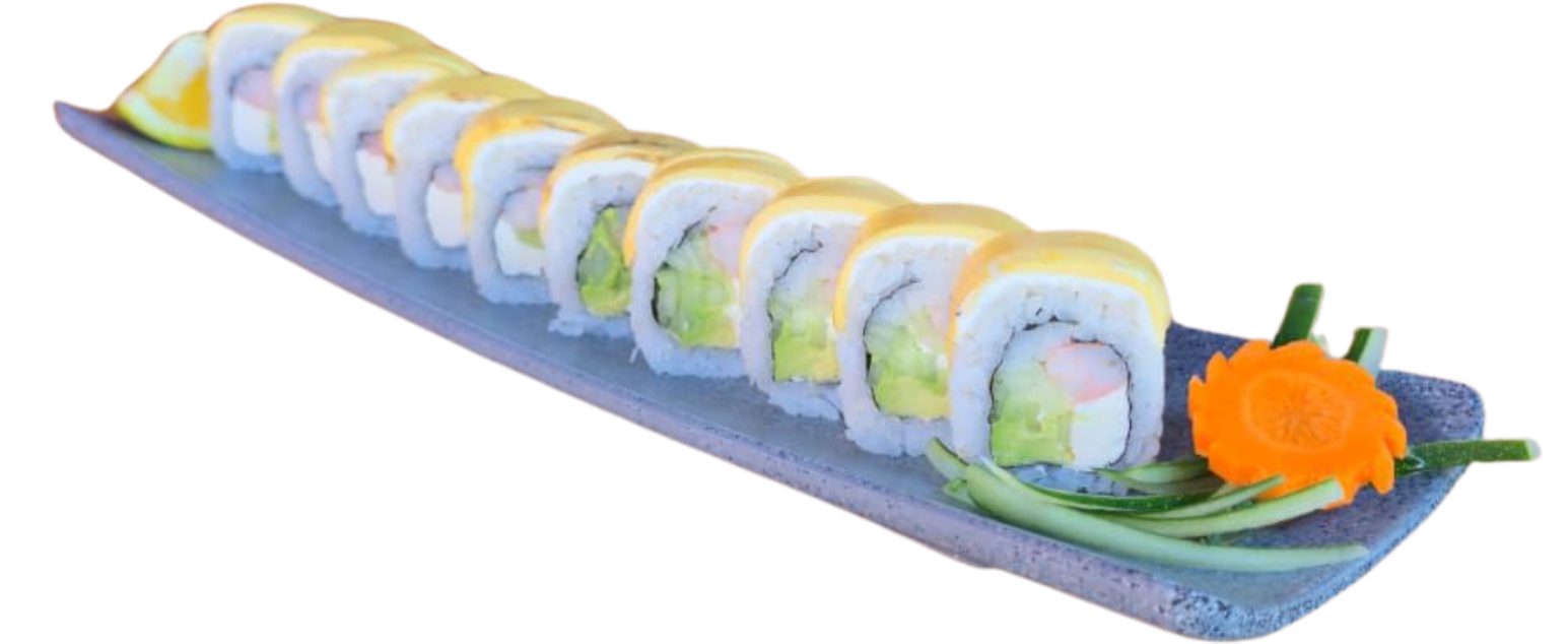 Rollitos rellenos de vegetales, coronados con aguacate, kanikama, philadelphia, anguila, cebollín y ajonjolí. Servidas en una cama de arroz gohan. (4 piezas)