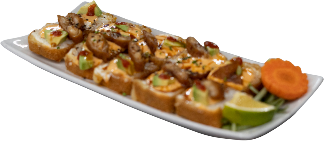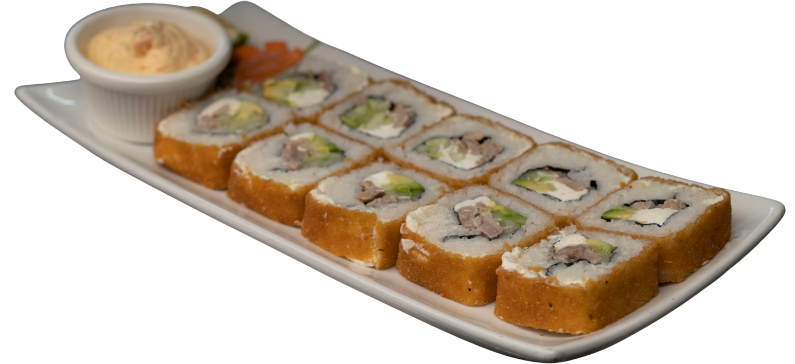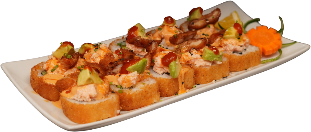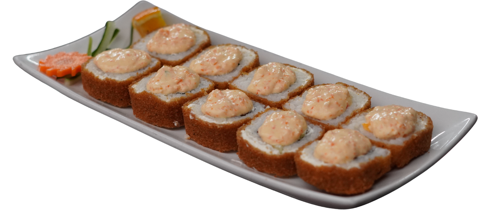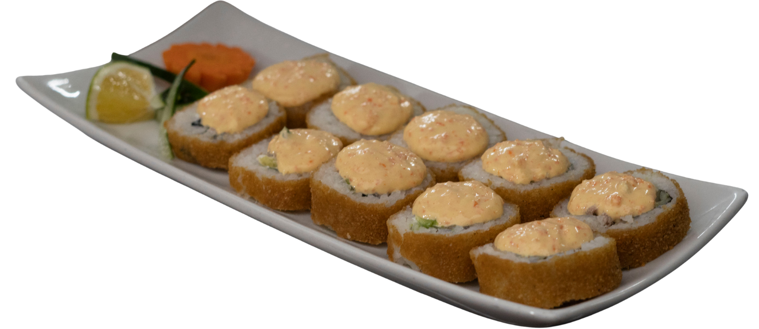 Rollo empanizado, relleno de tocino, pollo, camarón y queso gouda; coronado con aderezo chipotle y trozos de aguacate.