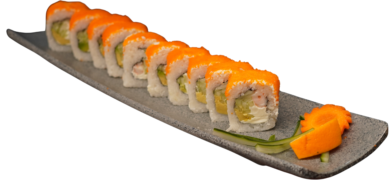 Rollo con aguacate, philadelphia y surimi por fuera; coronado con ensalada kanikama, trozos de camarón empanizado, rodajita de chile serrano y puntito de siriracha.