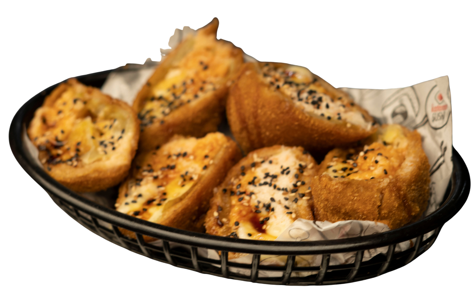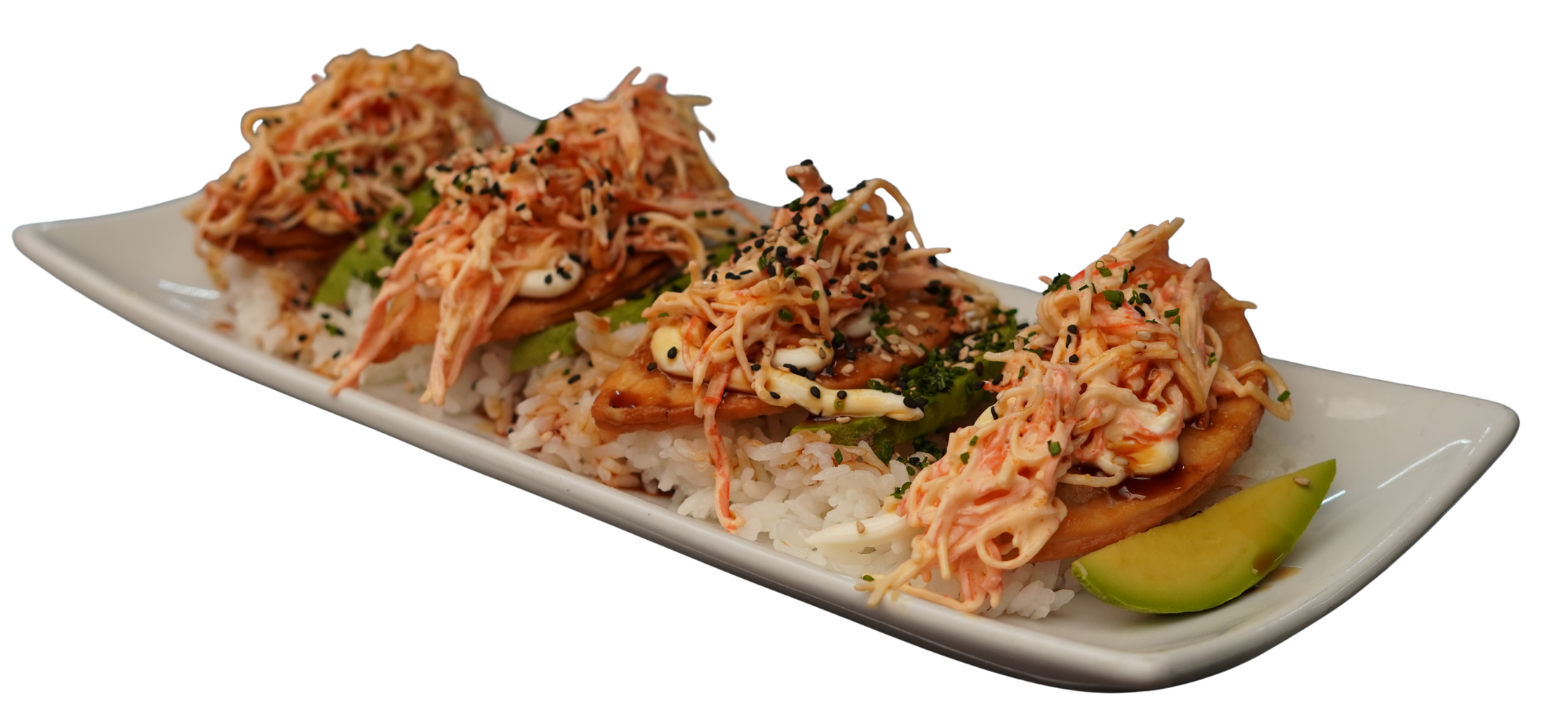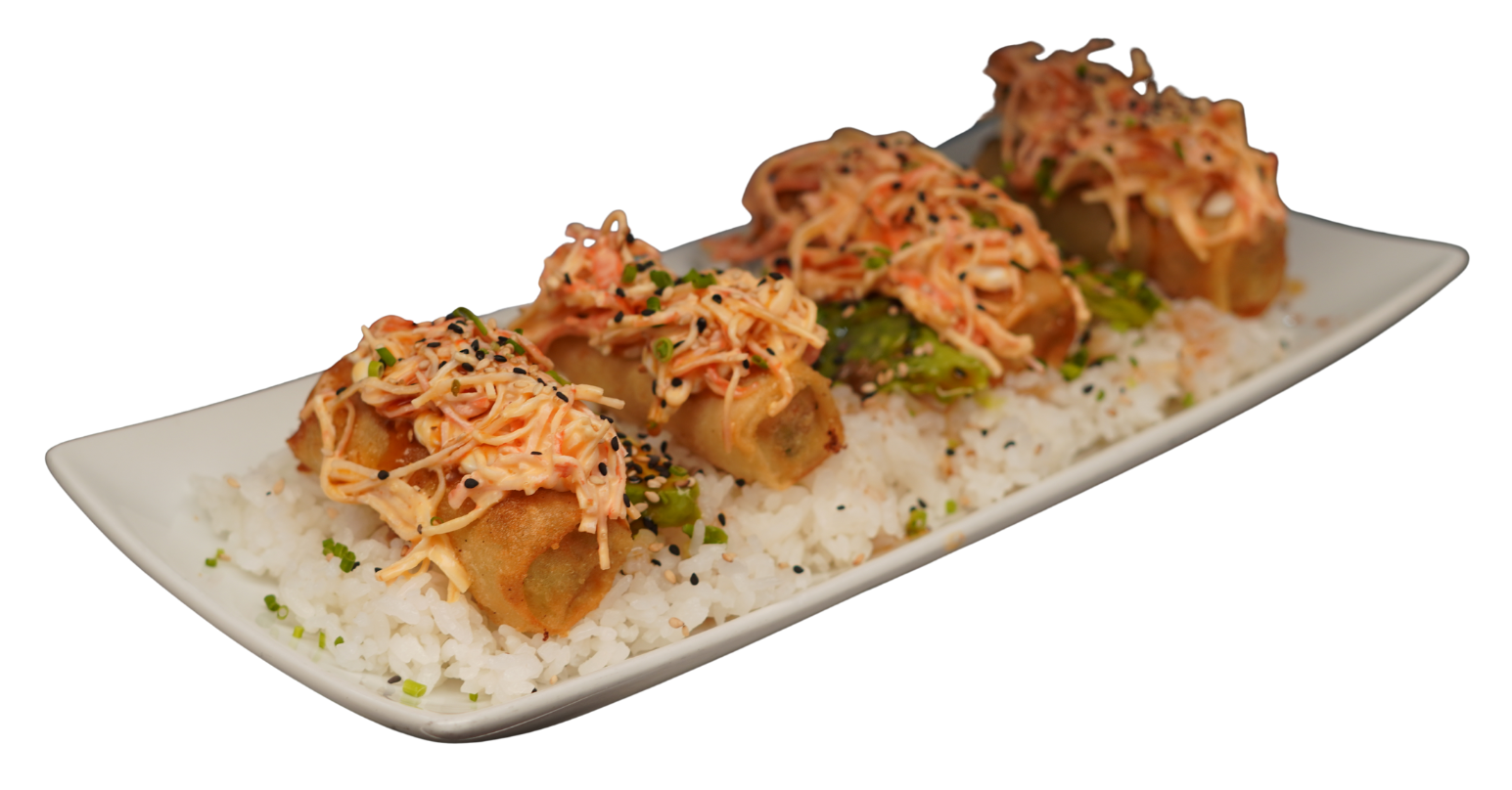 Empanaditas rellenas de res con verduras, coronadas con aguacate, kanikama, philadelphia, anguila, cebollín y ajonjolí. Servidas en una cama de arroz gohan. (4 piezas)
