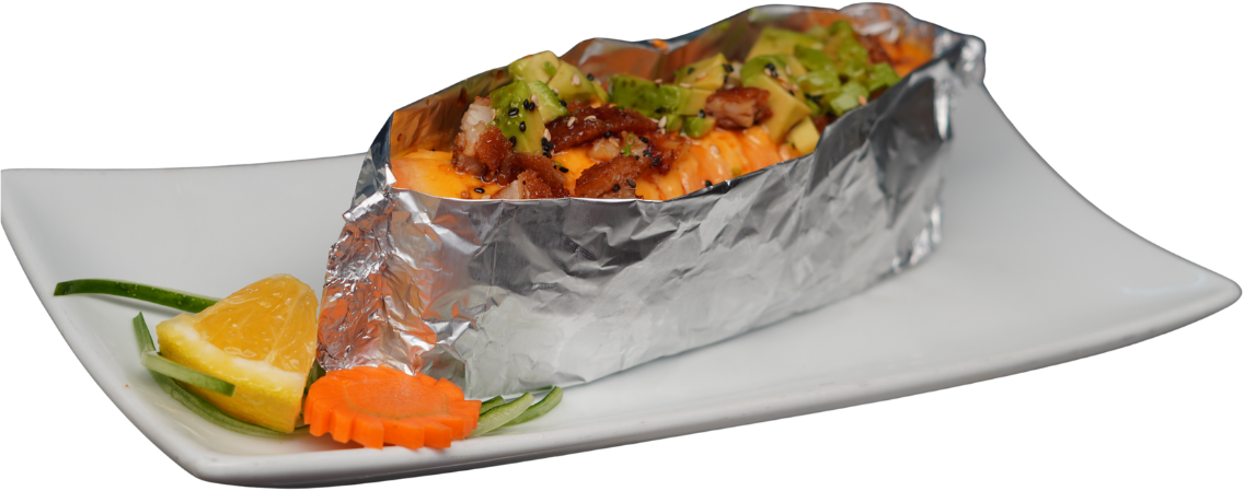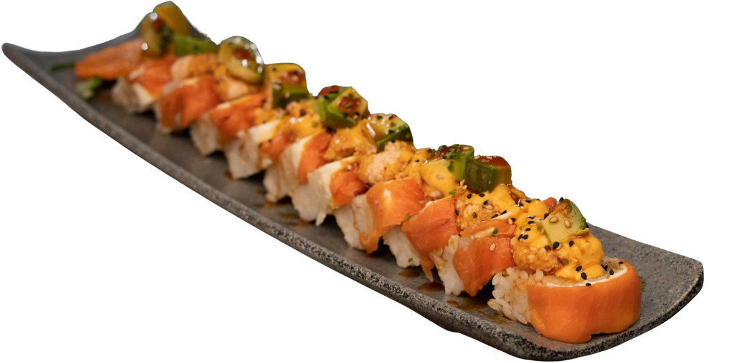 Piel de salmón frita y philadelphia por fuera; coronado con aderezo de mariscos, aguacate, trozos de camarón empanizado y puntito de sriracha.