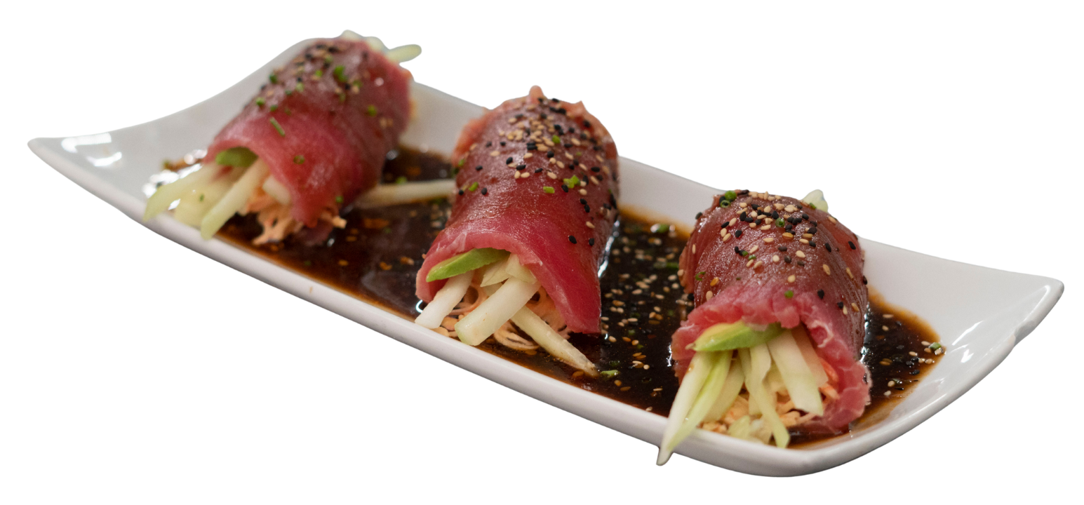 Rollos de atún rellenos de pepino, aguacate y ensalada kani. Bañados en salsas negras con chile de árbol en aceite de ajonjolí.