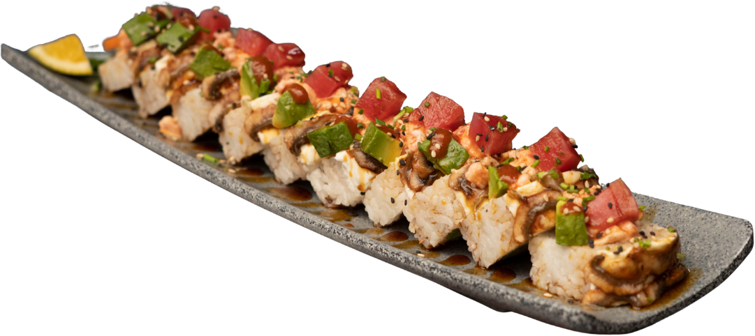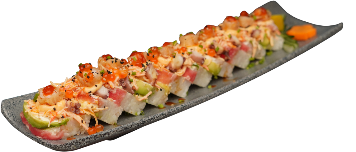 Rollo relleno de camarón, cobertura atún y aguacate. Coronado con ensalada kanikama y aderezo de masago, camarón tempura, pulpo, caviar de salmón, twist de limón y puntito de sriracha.
