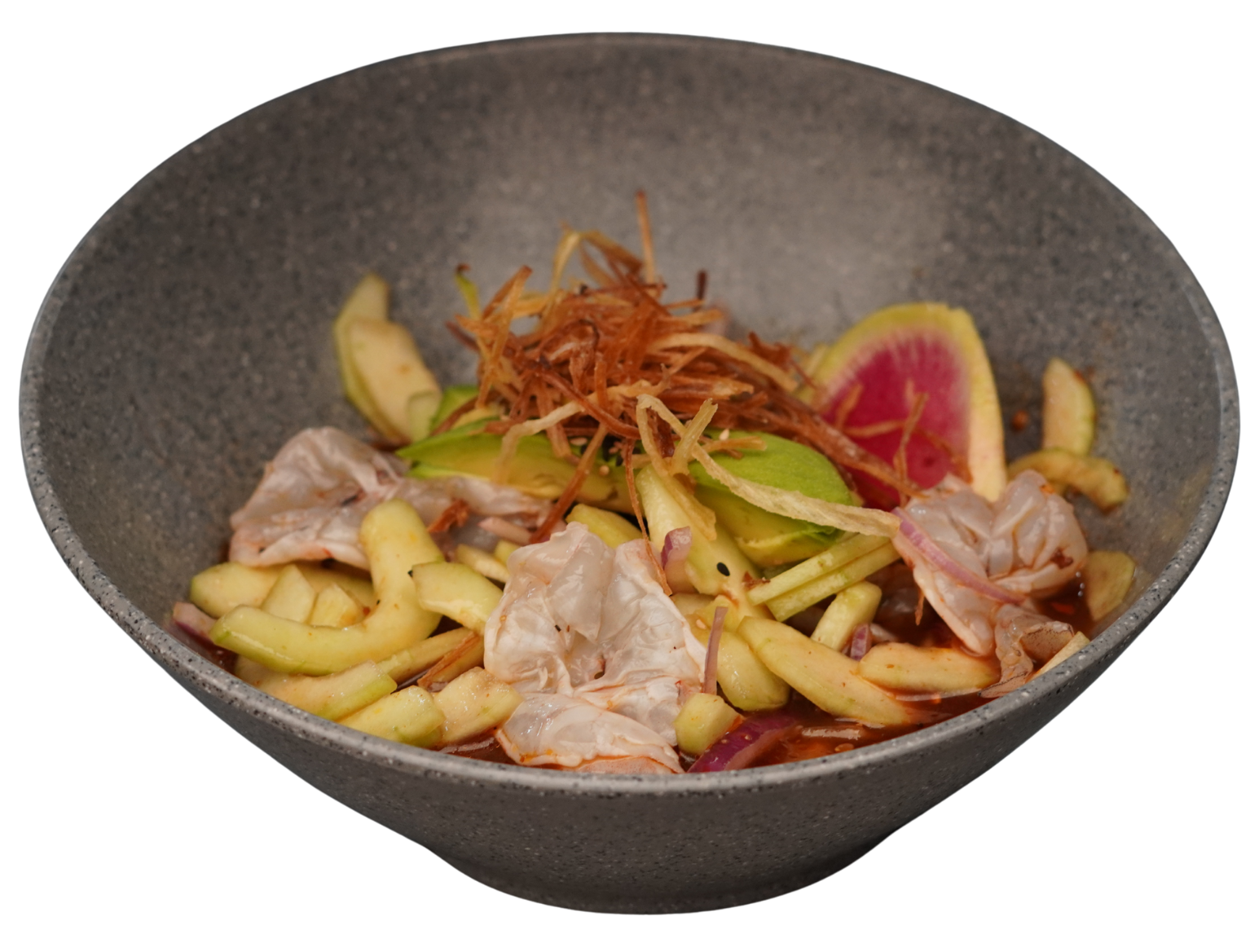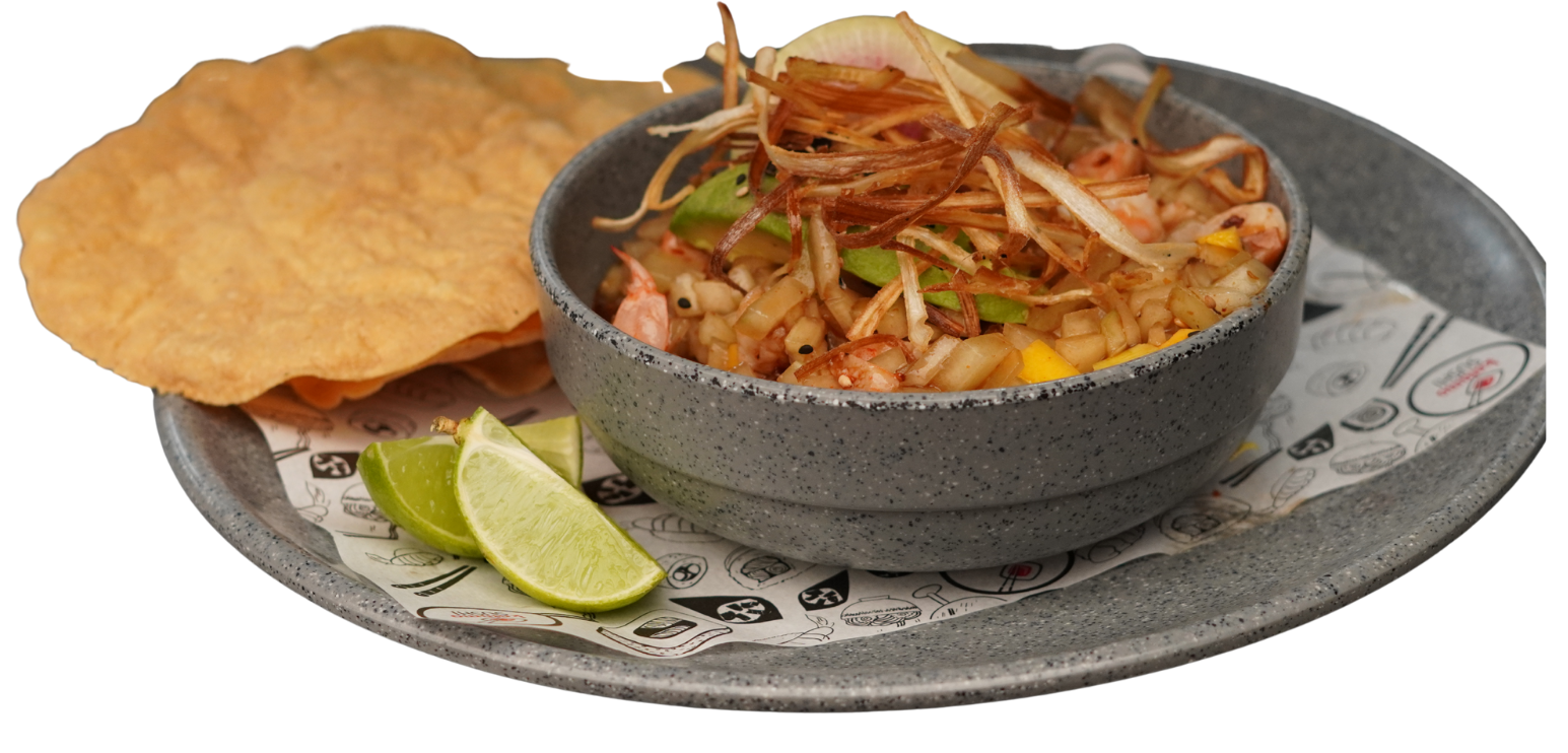 Camarón fresco, cebolla morada, pepino en julianas, marinado con salsas negras de la casa, un toque de chile de árbol enaceite, aguacate, ajonjolí y poro frito.