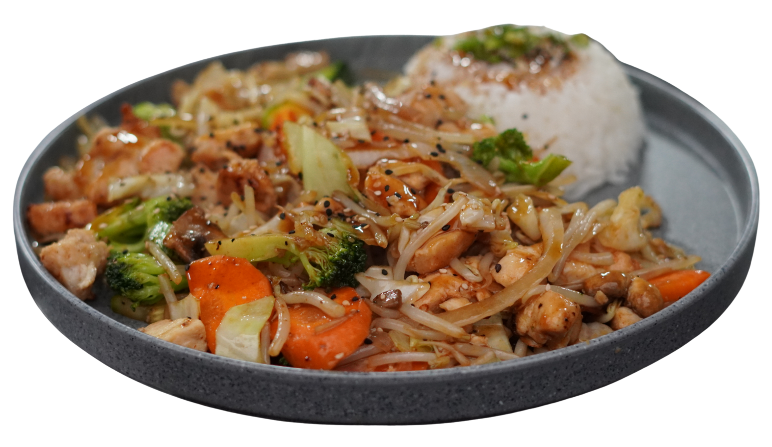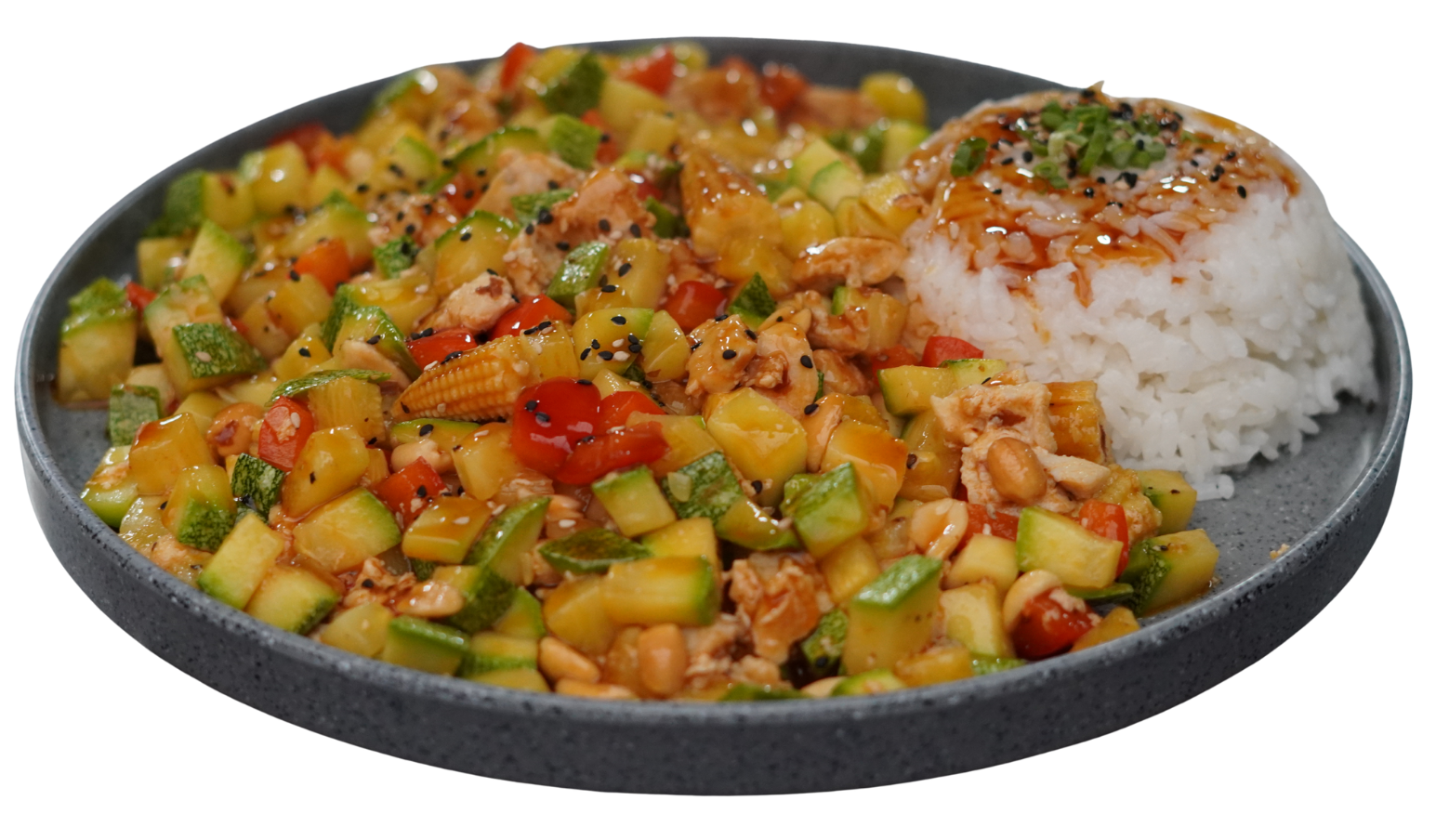 Pollo salteado con pimiento rojo, calabaza, cacahuate, elotitos baby y salsa teriyaki. Porción de arroz gohan coronado con cebollín y ajonjolí negro.