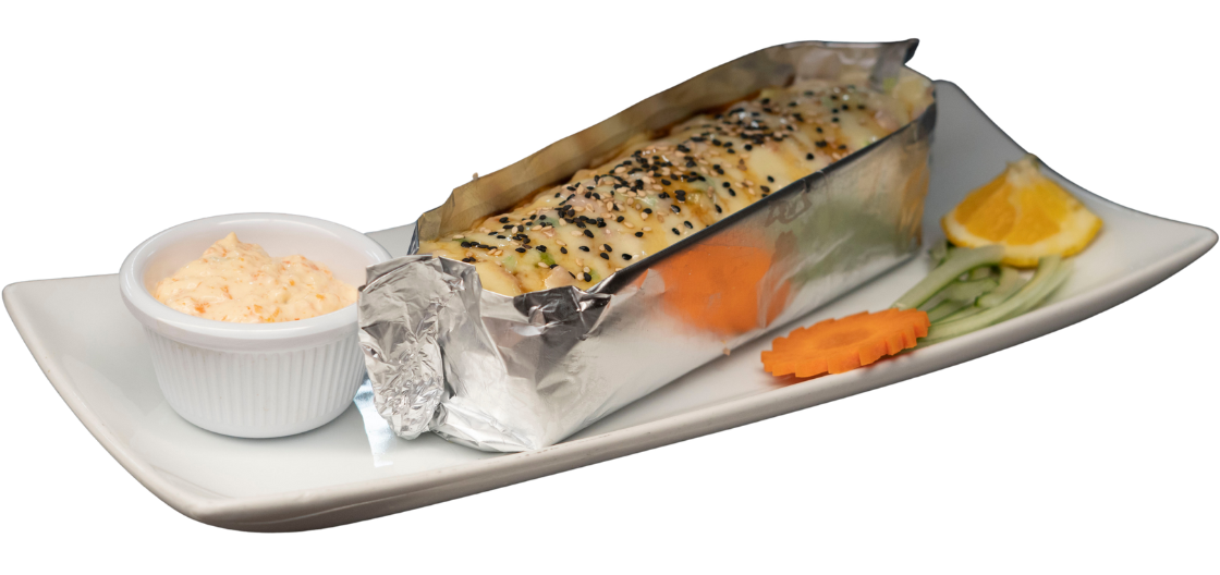 Rollo horneado de salmón con aderezo de mariscos; coronado con trocitos de camarón empanizado y aguacate.