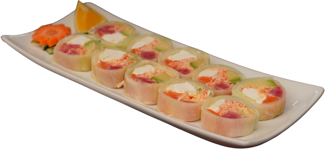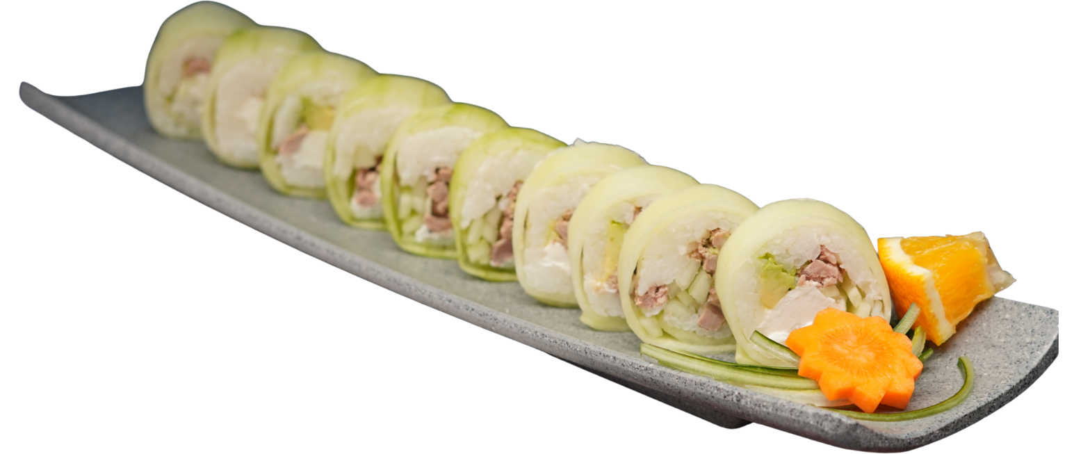 Rollo con cobertura de pepino, relleno de ensalada kanikama, atún, salmón, queso philadelphia y aguacate. (Sin arroz)