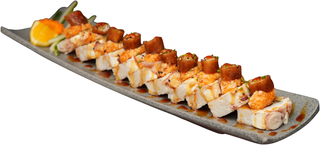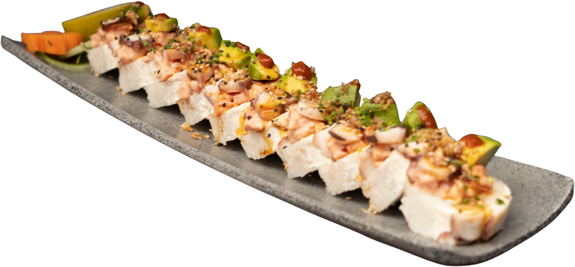 Rollo Relleno de camarón, cobertura pulpo, coronado con ensalada de atún spicy, trozos de pulpo, aguacate, piel de salmón frita y puntito de sriracha.
