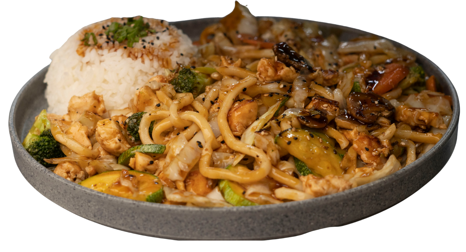 Pasta udón con una mezcla de verduras en salsa teriyaki. Porción de arroz gohan. Pollo $210 Res $220 Camarón $230 Mixto $230
