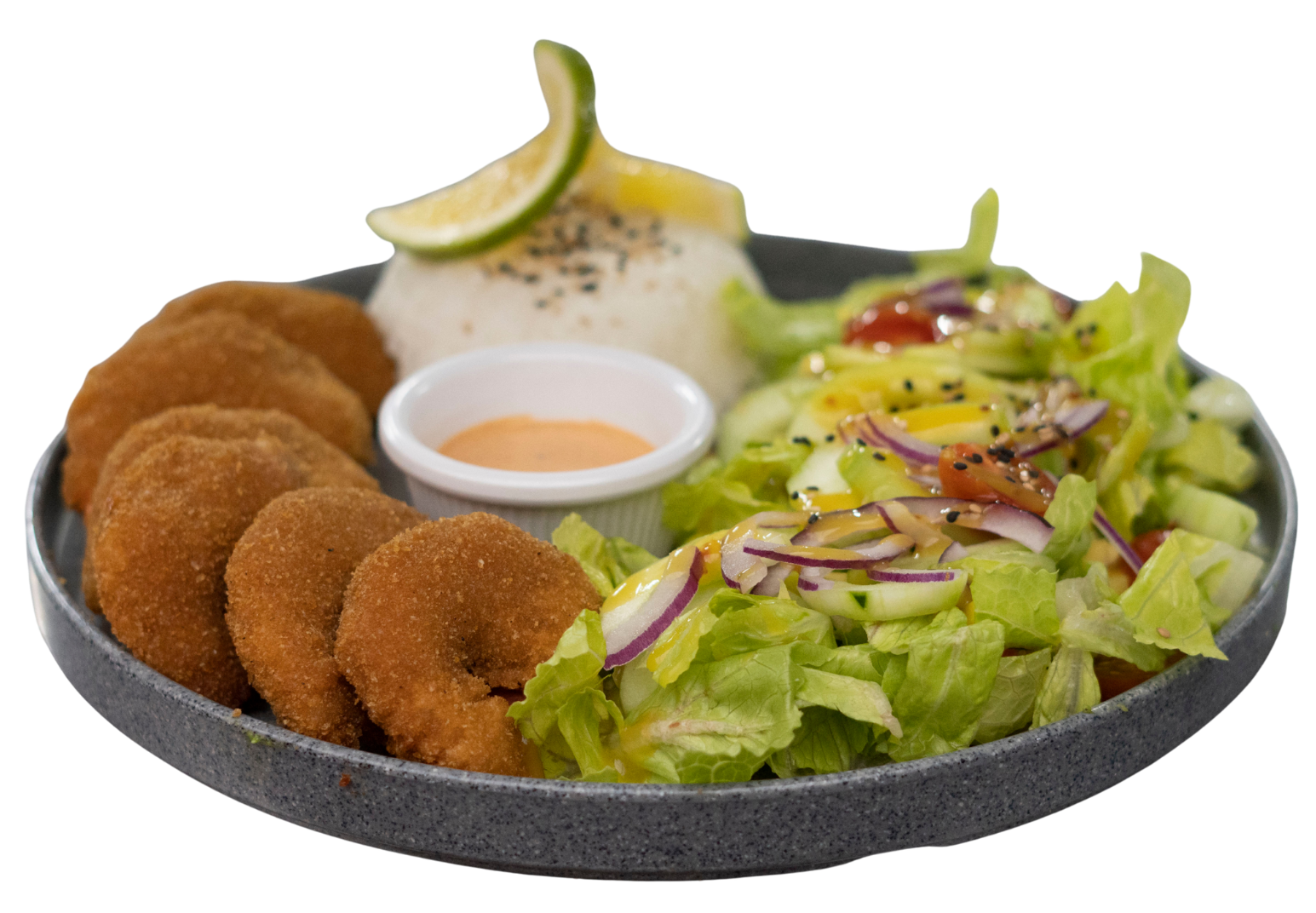 Camarones empanizados rellenos de queso philadelphia, acompañados de arroz gohan y ensalada del bosque.