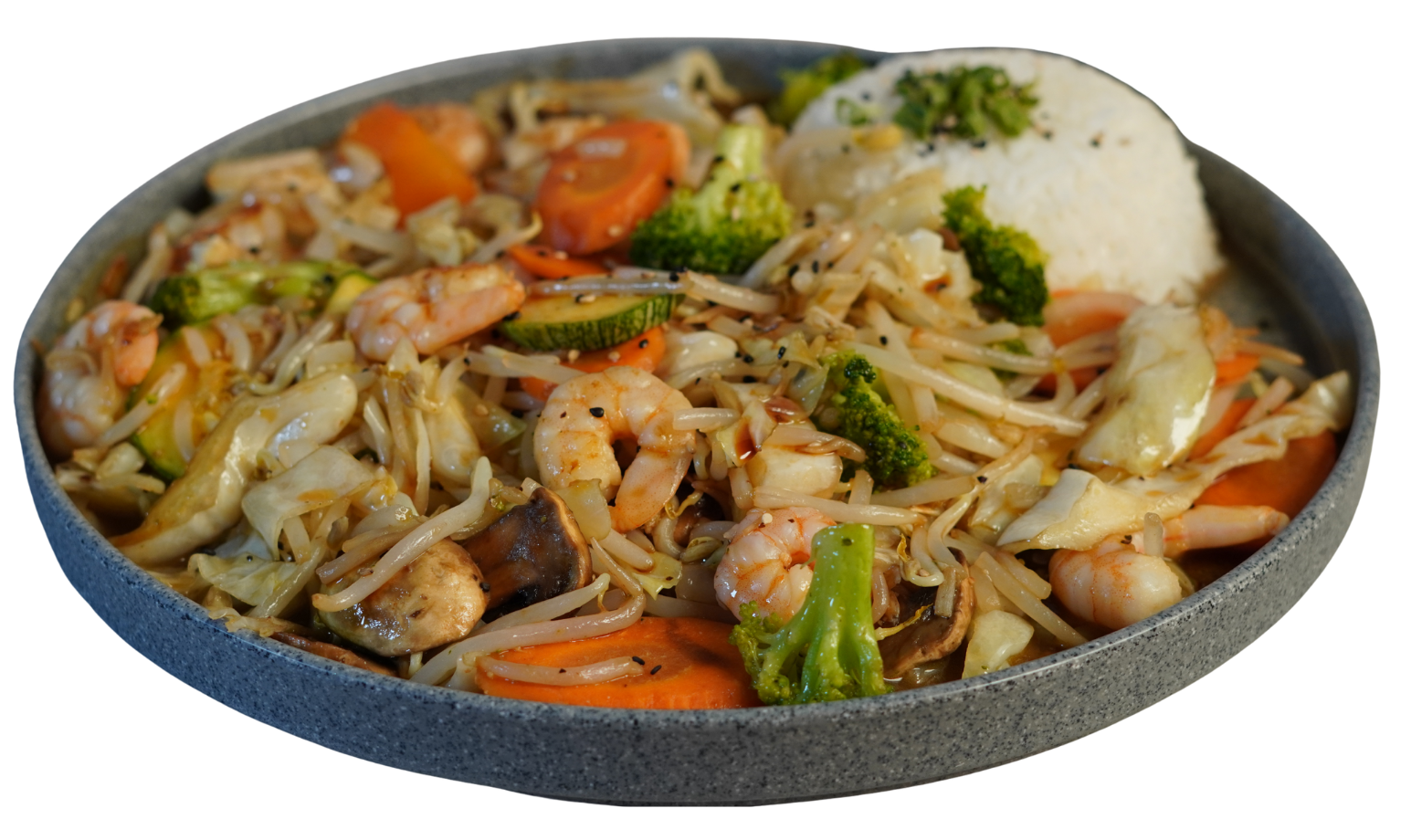 7 verduras sancochadas a la plancha con salsa teriyaki. Porción de arroz gohan coronado con cebollín y ajonjolí negro. Pollo $205 Res $215 Camarón $229 Mixto $229