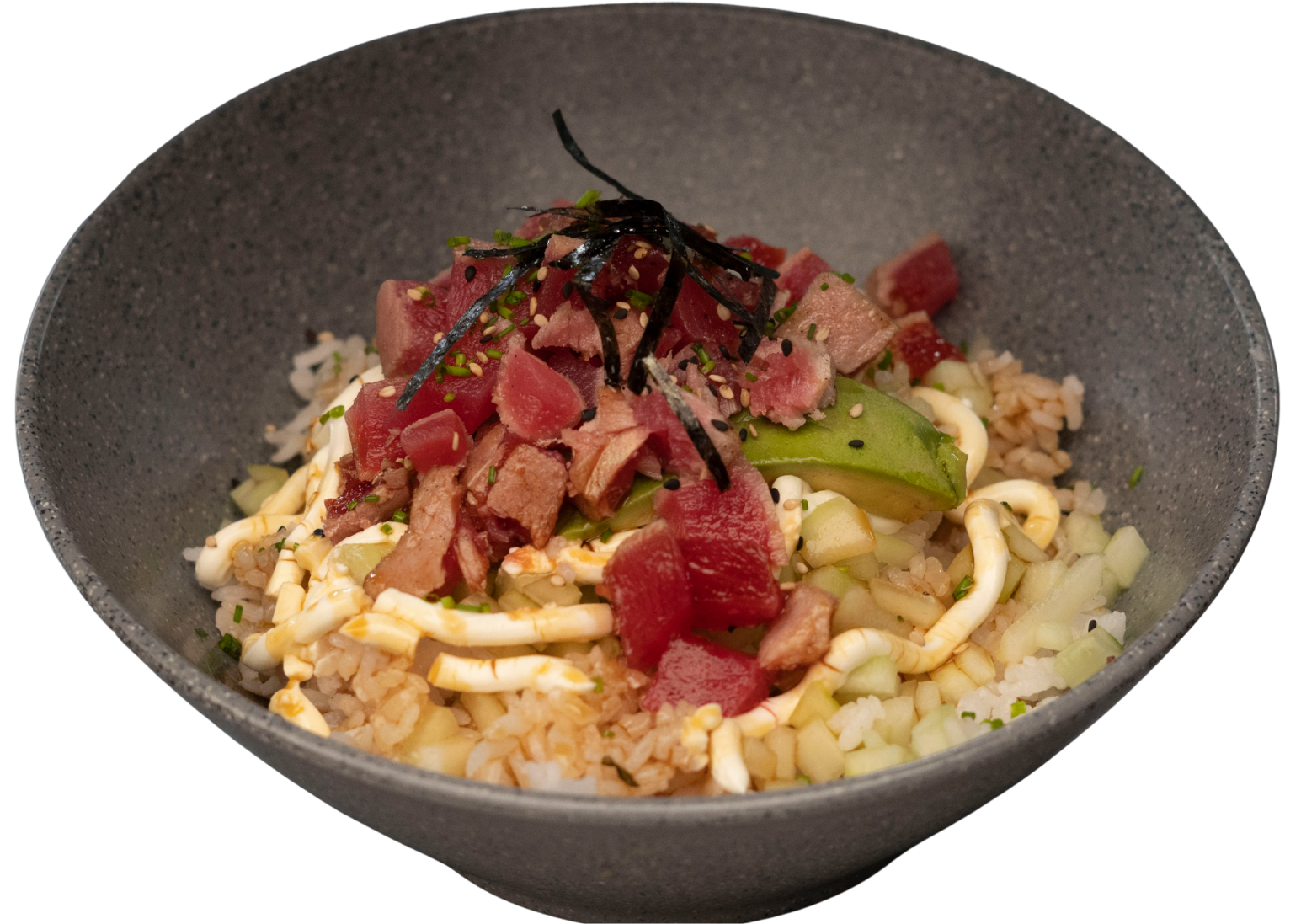 Arroz gohan con trozos de atún sellado a la plancha, pepino, aguacate y philadelphia. Bañado con salsa de anguila, cebollín y ajonjolí.