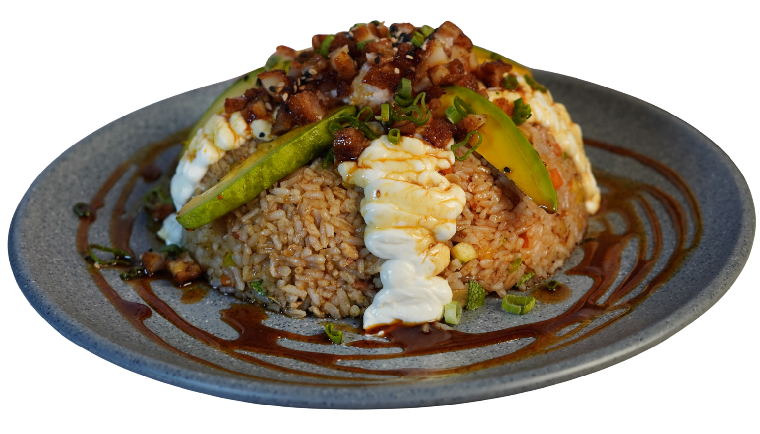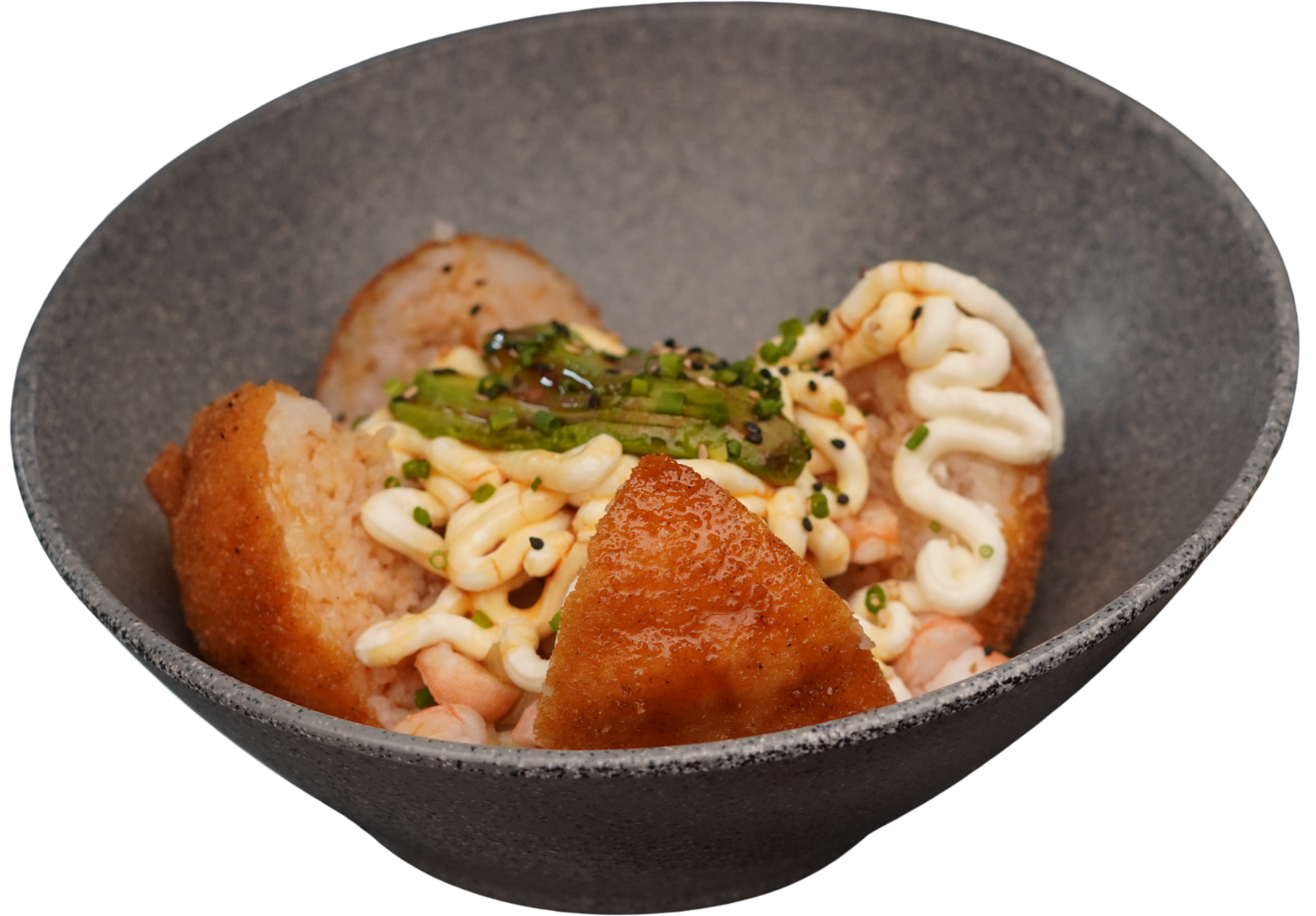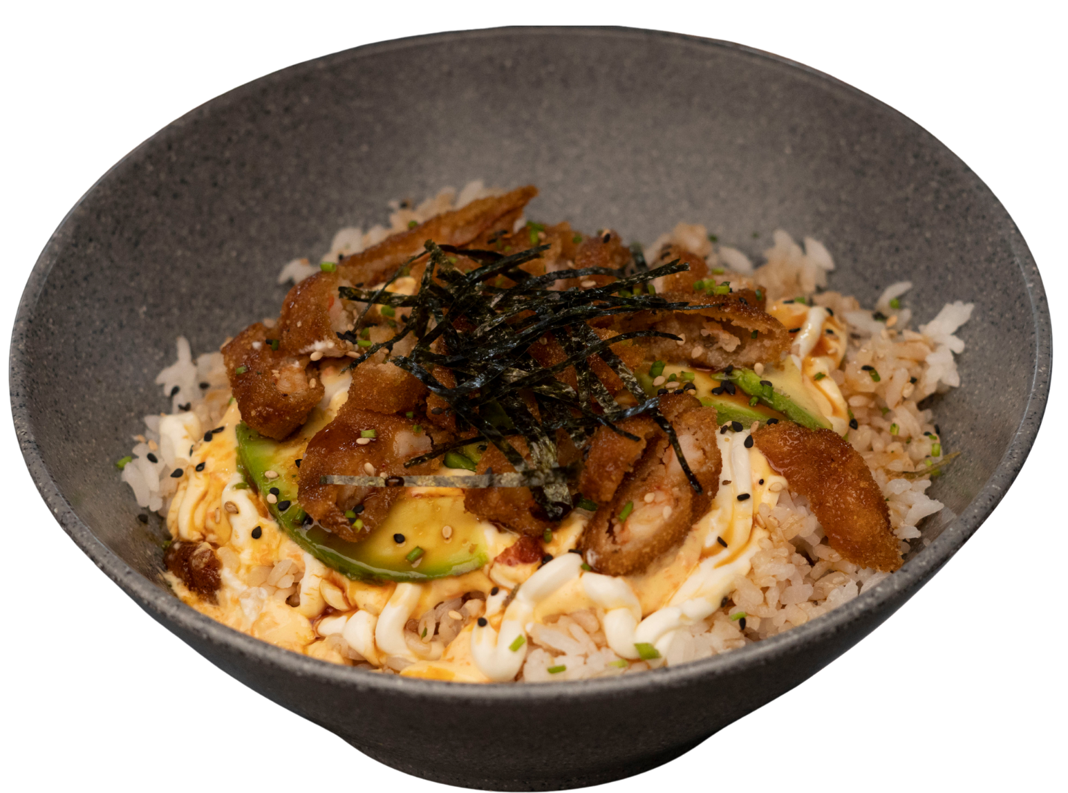 Arroz frito con verduras, coronado con philadelphia, aguacate, ensalada kani y trocitos de camarón empanizado. Bañado con salsa de anguila con un toque de cebollín y ajonjolí.