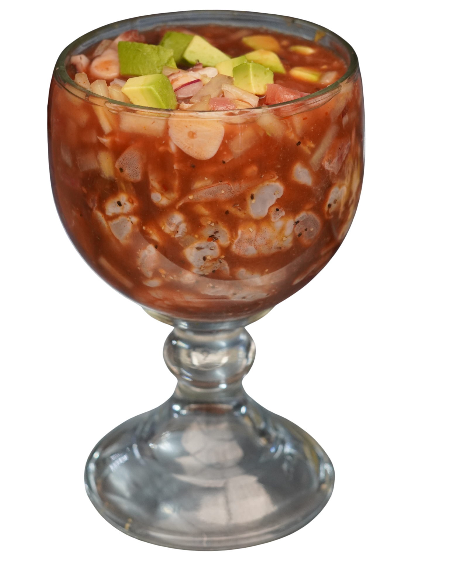 Camarón en aguachile, camarón cocido, pulpo, atún fresco, pepino, aguacate, cebolla, clamato y salsas negras.