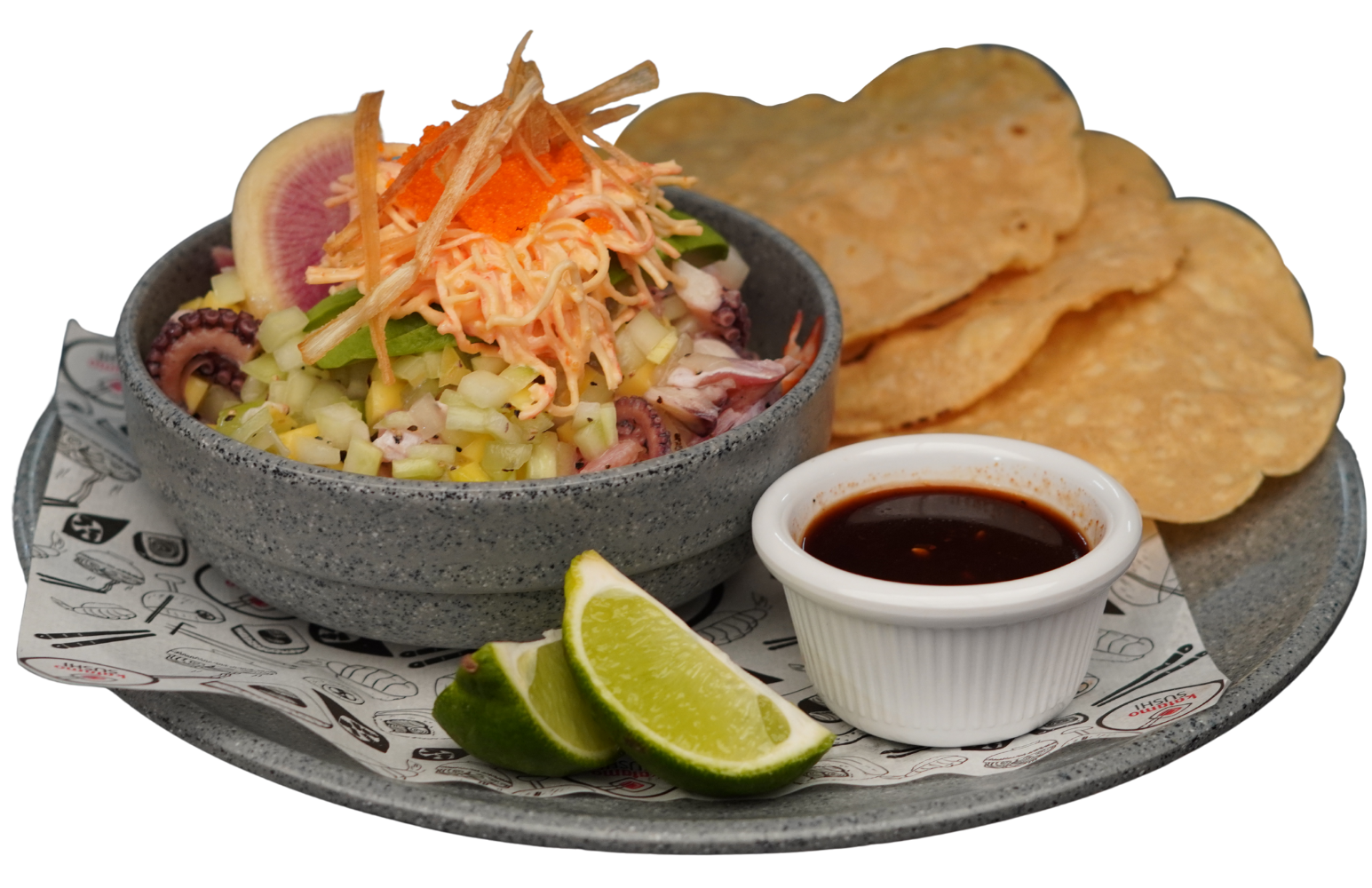 Ceviche de camarón, pulpo, surimi y atún. Preparados con limón, soya, shichimi, aceite de ajonjolí, aguacate, ajonjolí y poro frito.
