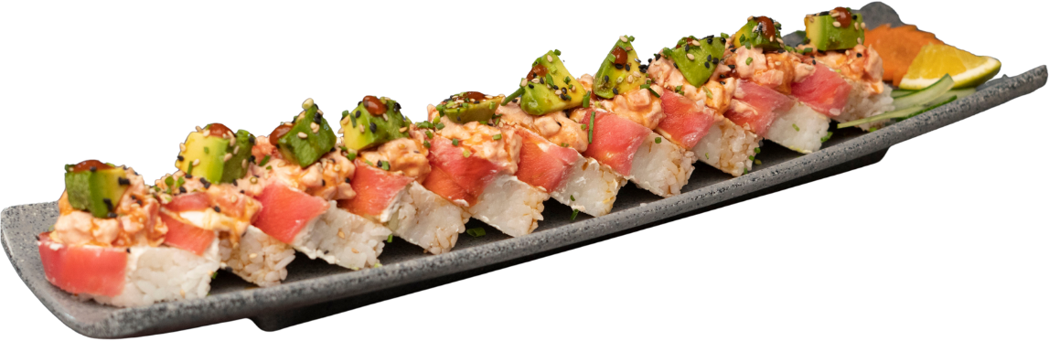 Atún por fuera; coronado con aderezo de atún spicy, trozos de aguacate y puntito de sriracha.