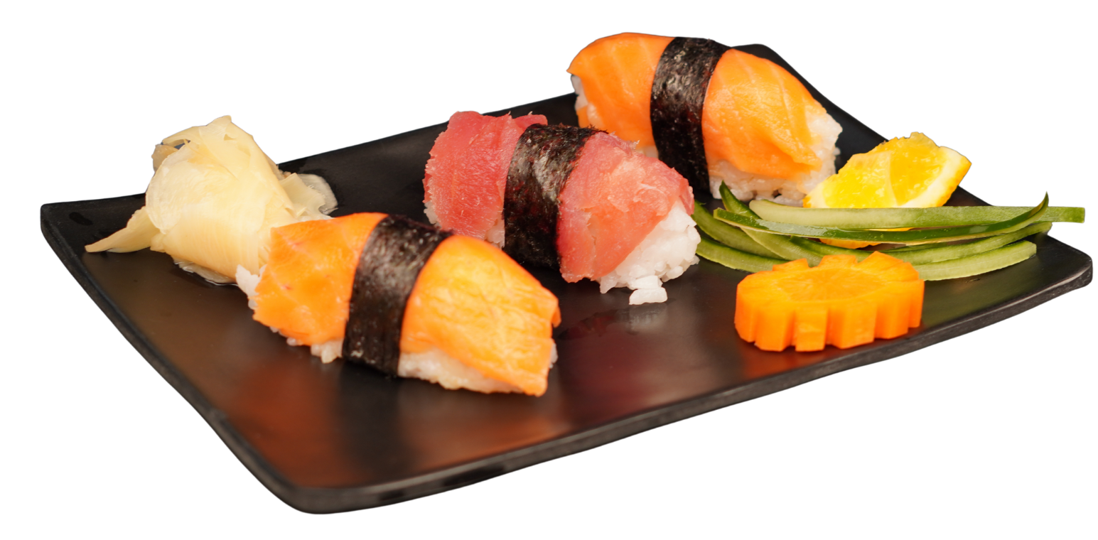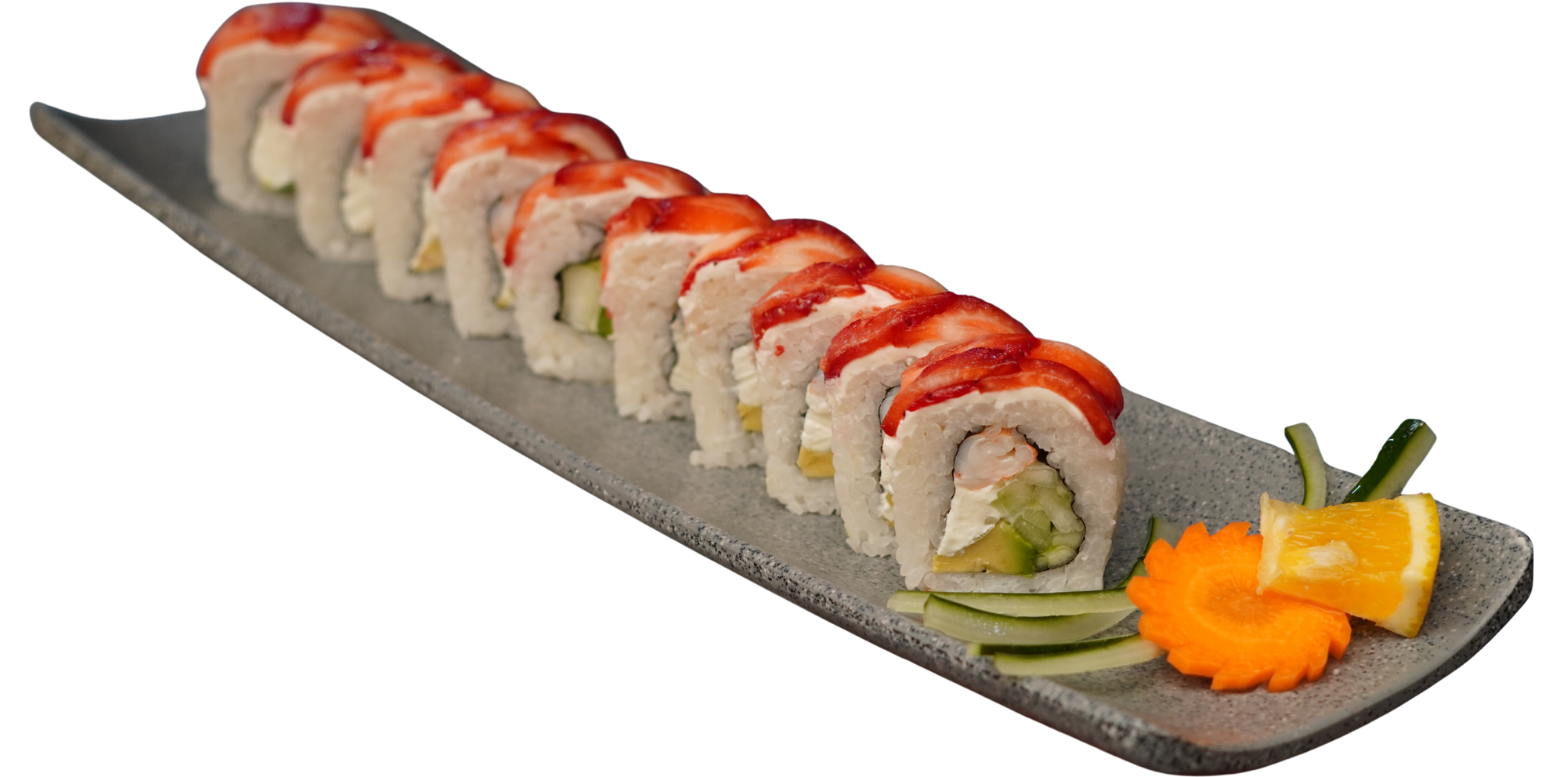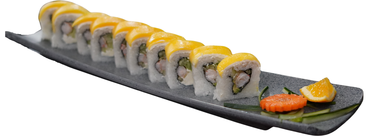 Arroz gohan con atún, camarón o salmón marinado, edamames, philadelphia, pepino, mango, aguacate, pepino,trozos de nori, anguila, cebollín y ajojolí.
