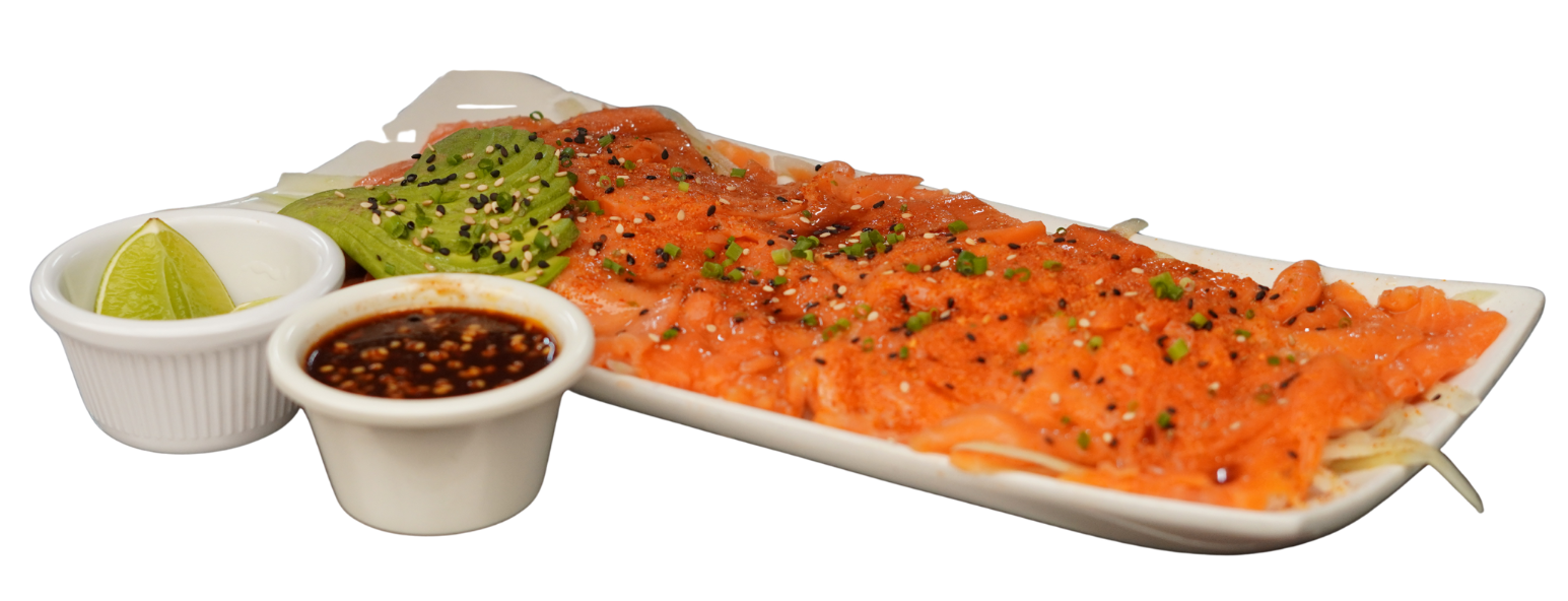 Laminas de atún, salmón o mixto, marinado en salsa de soya con un toque de aceite de ajonjolí y aguacate; montado sobre una cama de pepino rallado. Atún $210 Salmón $230 Mixto $230