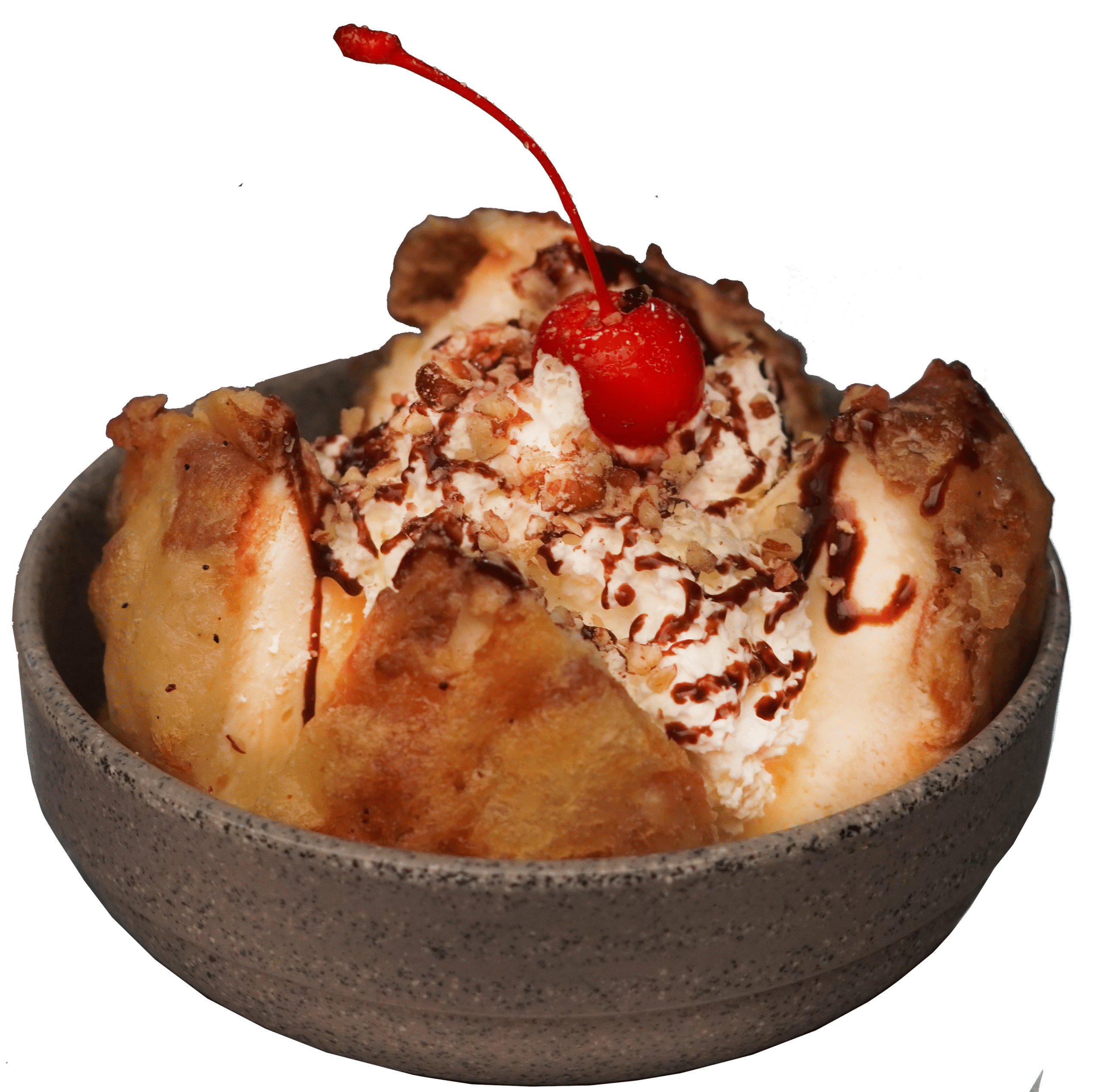 Bola de helado envuelta en pan, capeada y frita; servido con chantilly, chocolate liquido, nuez y cereza.